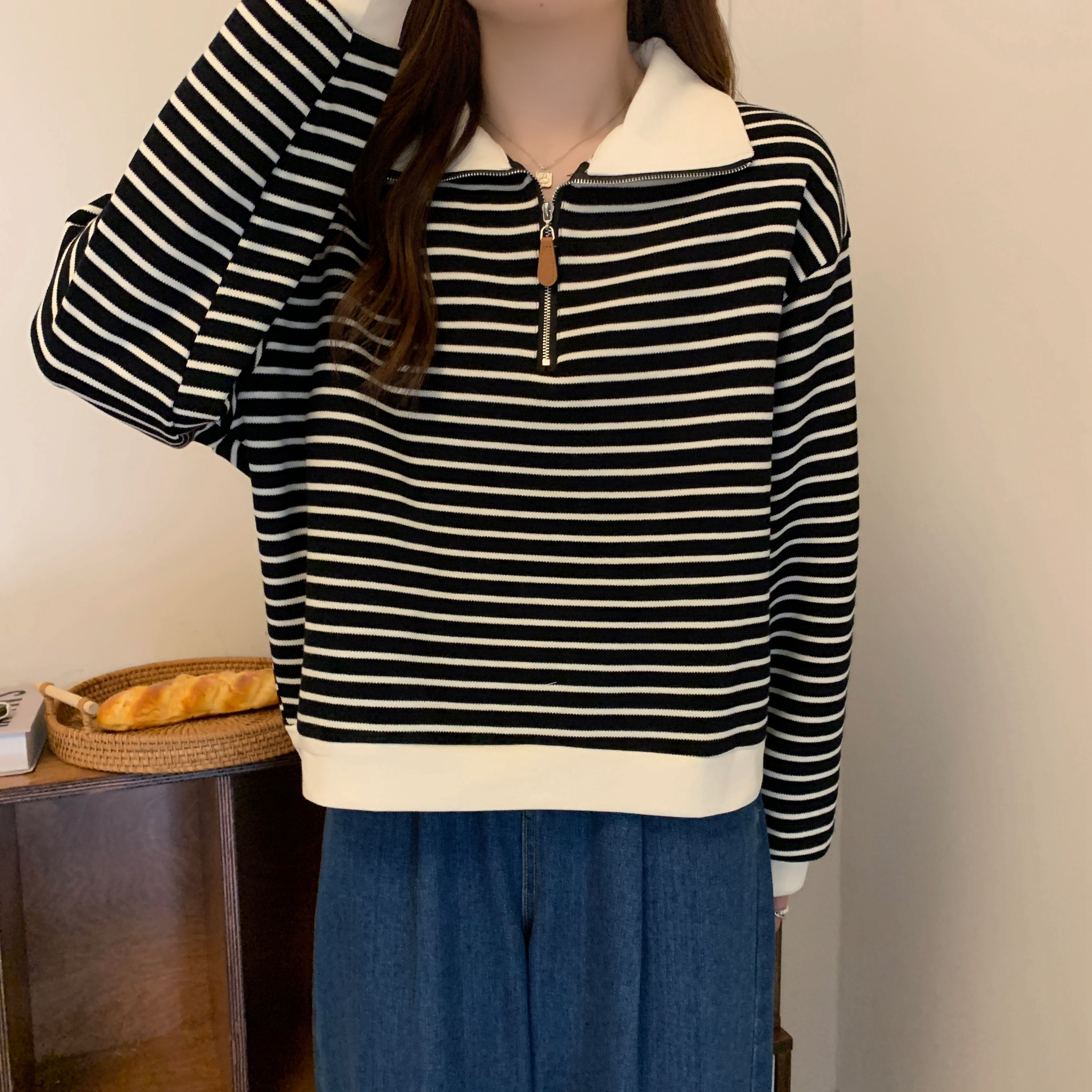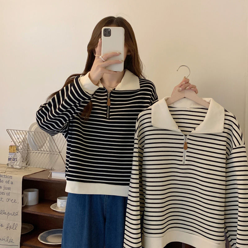 シンプルでありながら洗練された雰囲気を持つボーダー柄ポロカラーニットトレーナーが新登場
