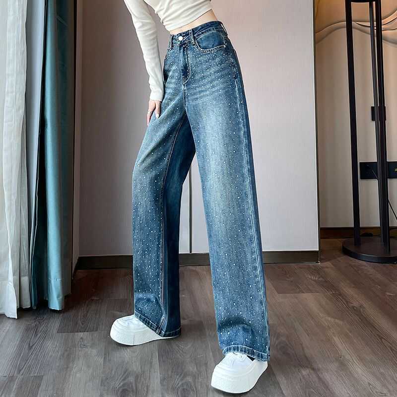レディース ハイウエスト ウォッシュデニムパンツ 美脚脚長ジーパン ブリーチデニムストレートパンツ 韓国風ジーンズお洒落