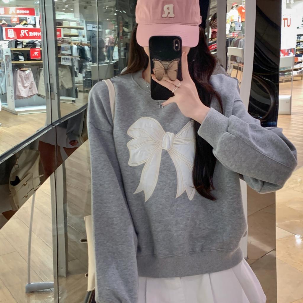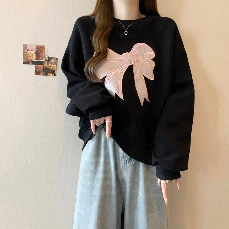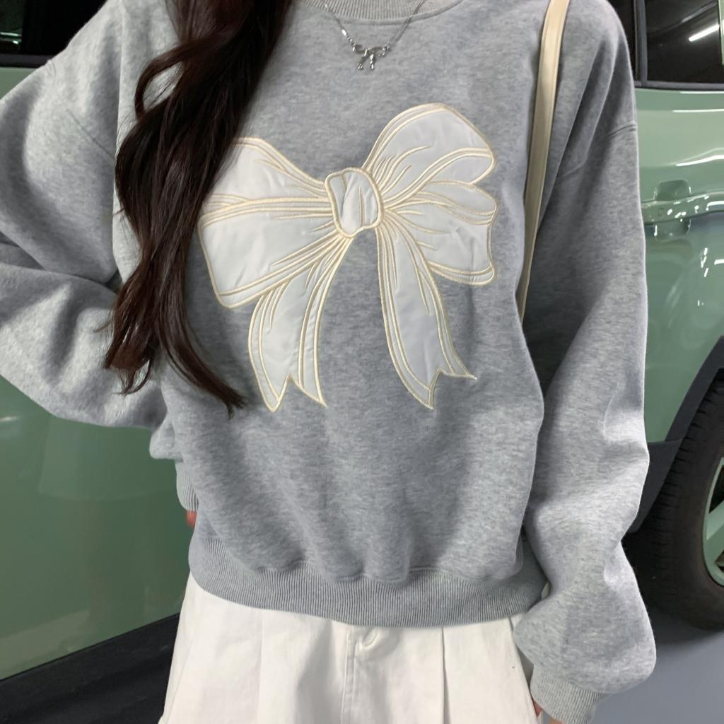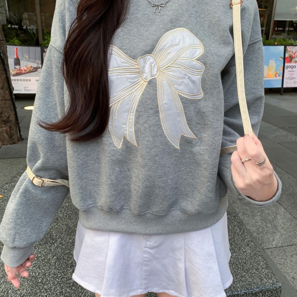 フロントに大きなリボンの刺しゅうを施し、フェミニンで可愛らしい印象を演出するスウェット