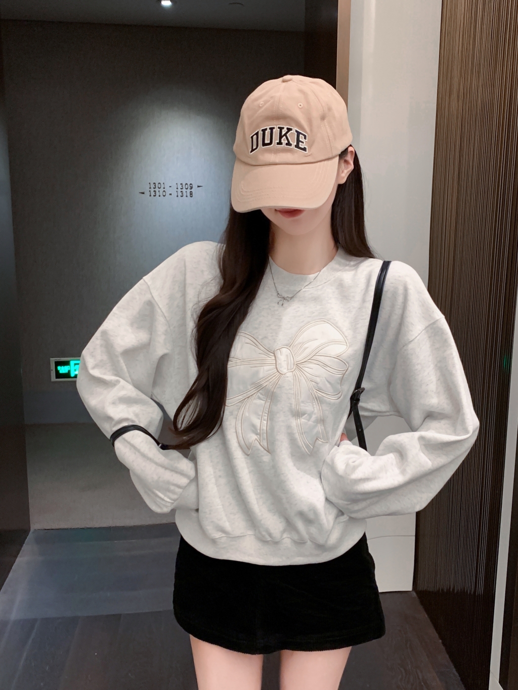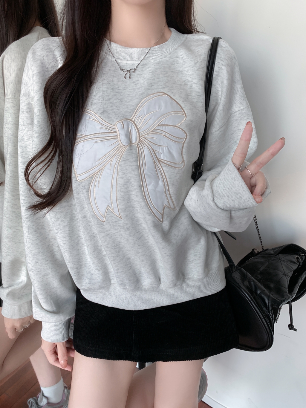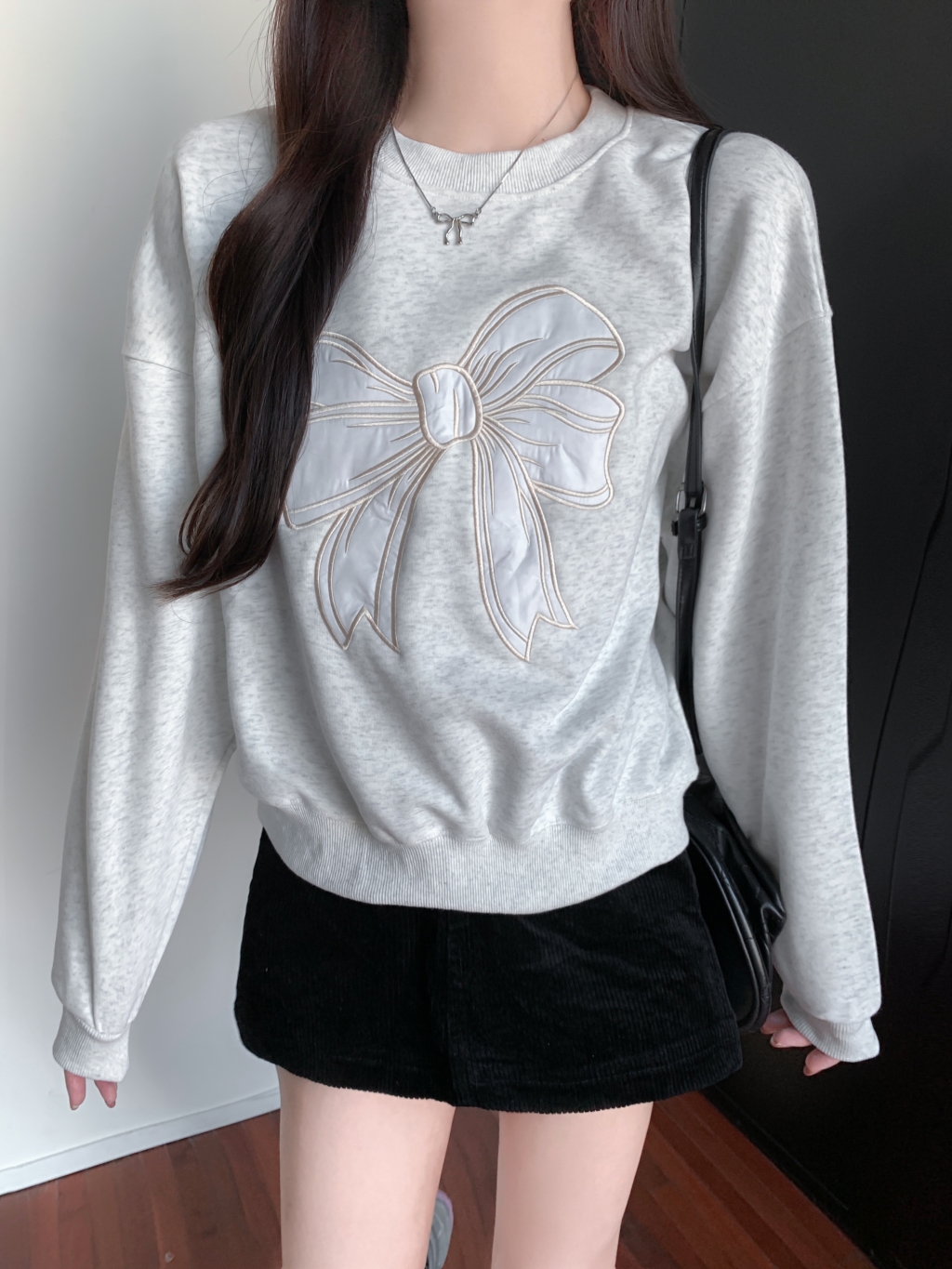 フロントに大きなリボンの刺しゅうを施し、フェミニンで可愛らしい印象を演出するスウェット