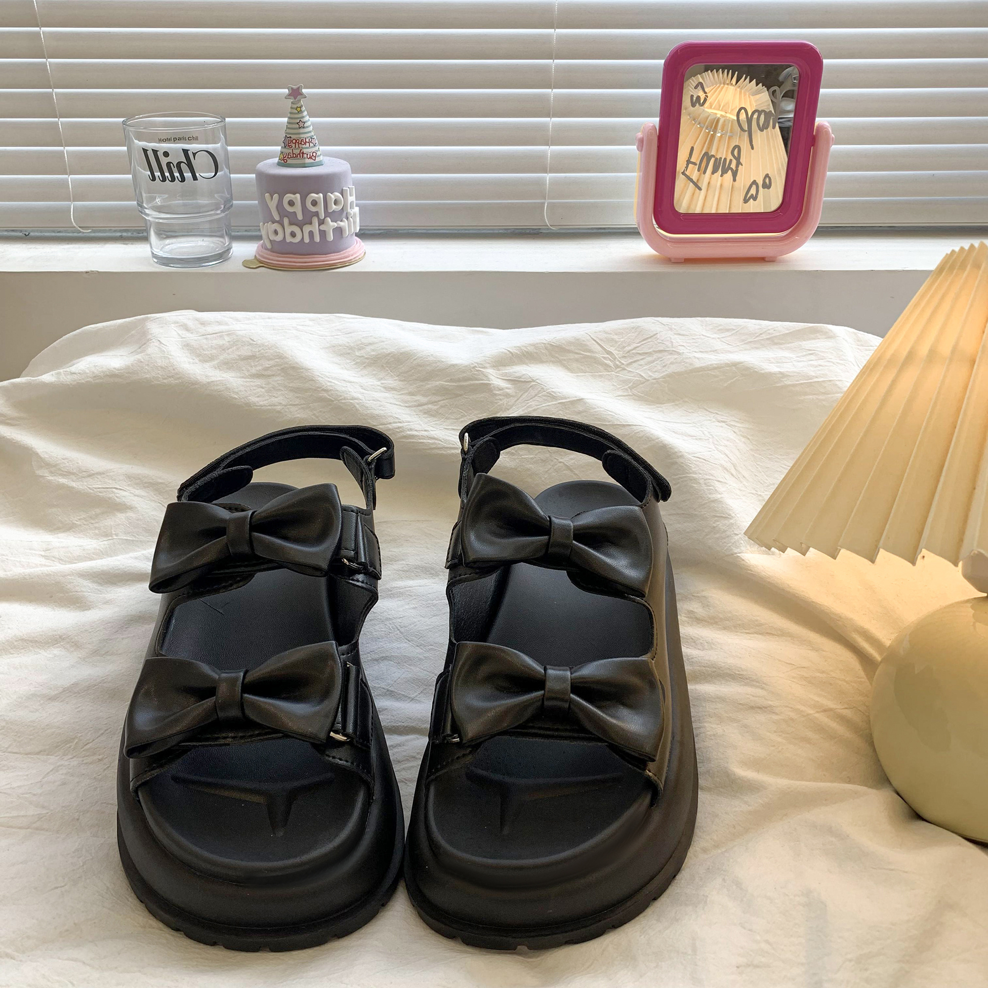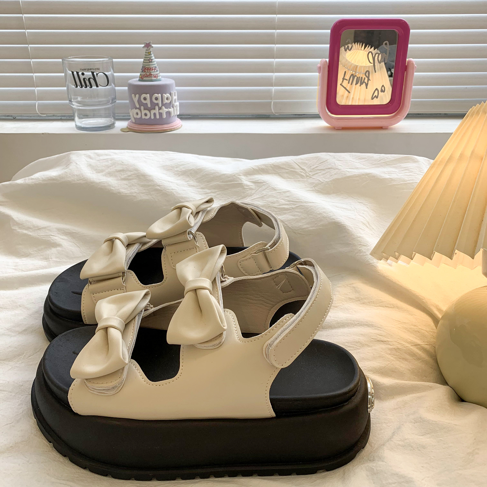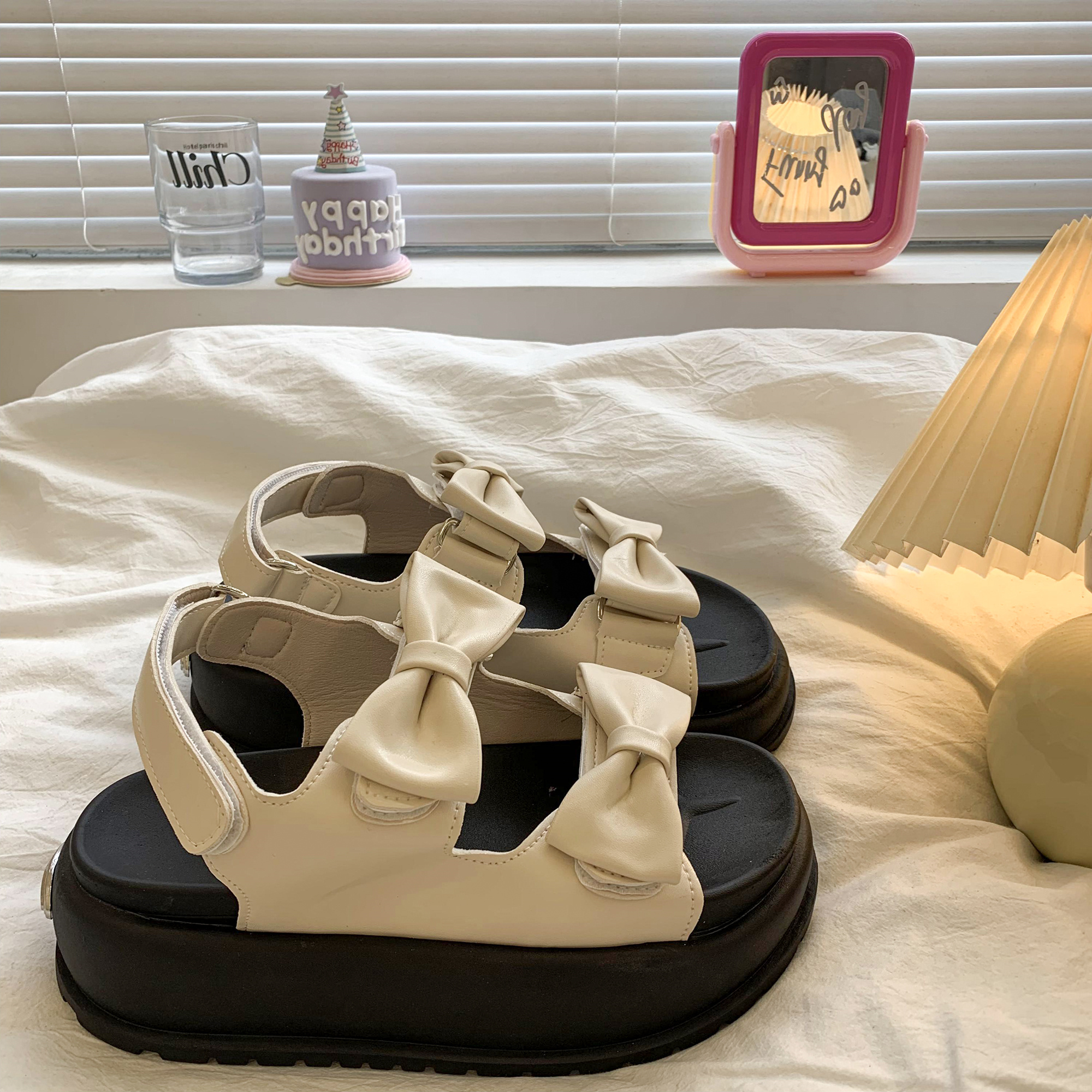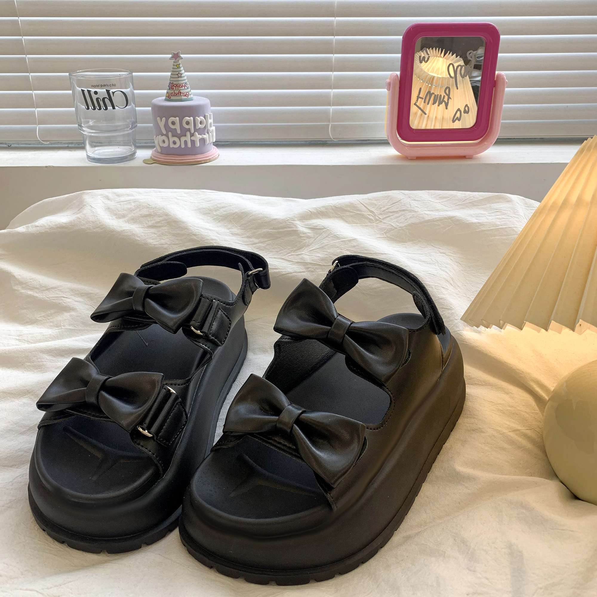太めのリボンストラップがかわいいウェッジソールサンダル。