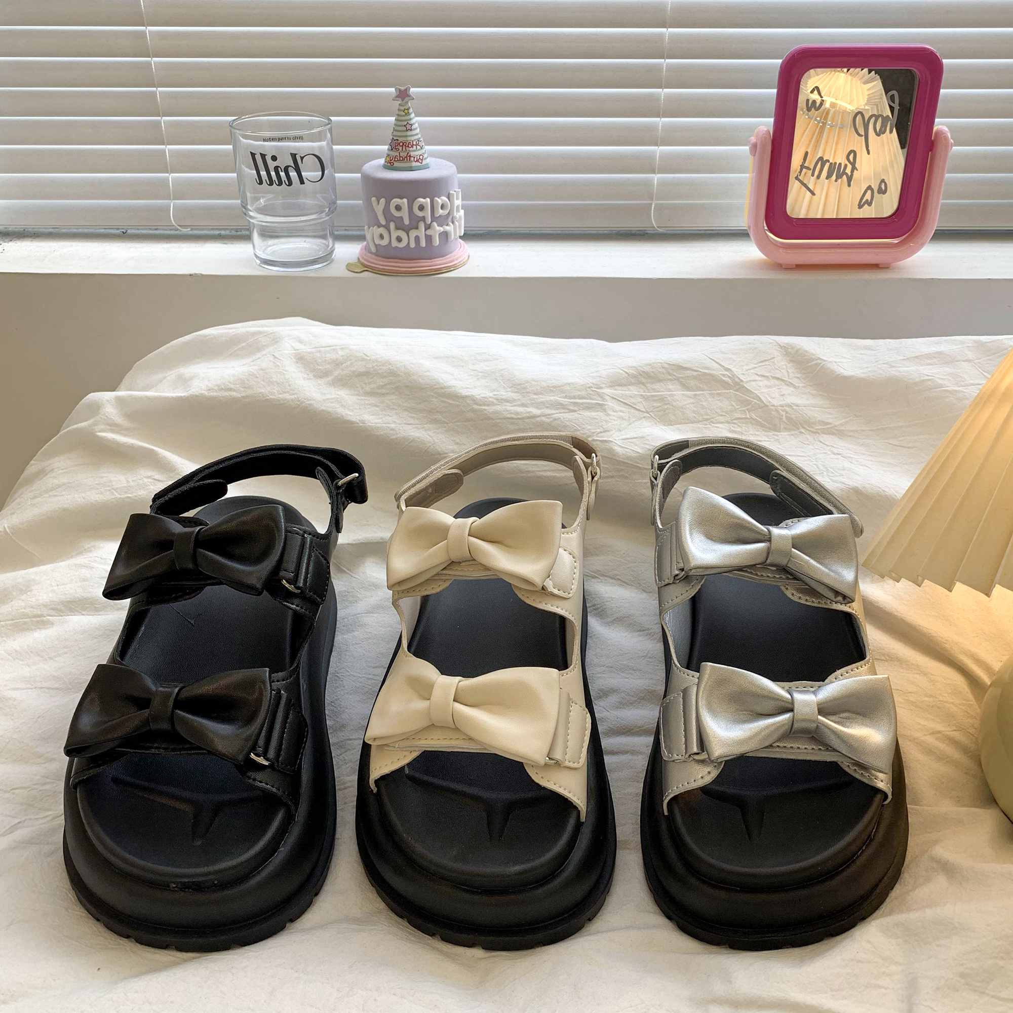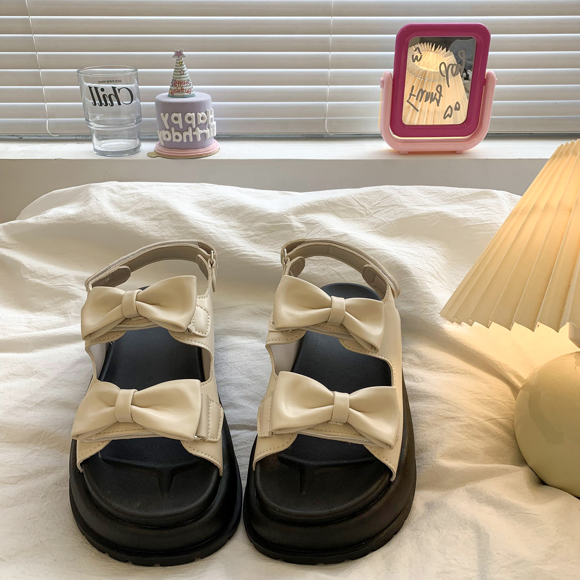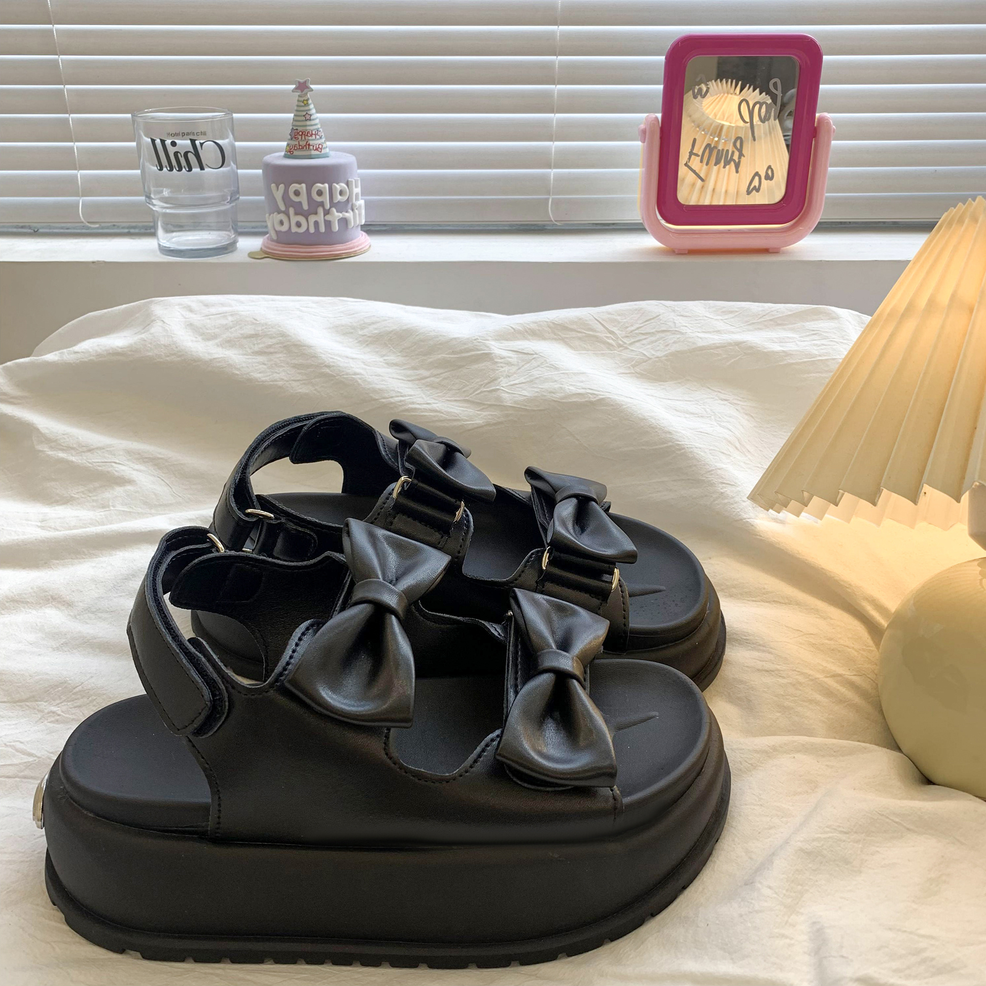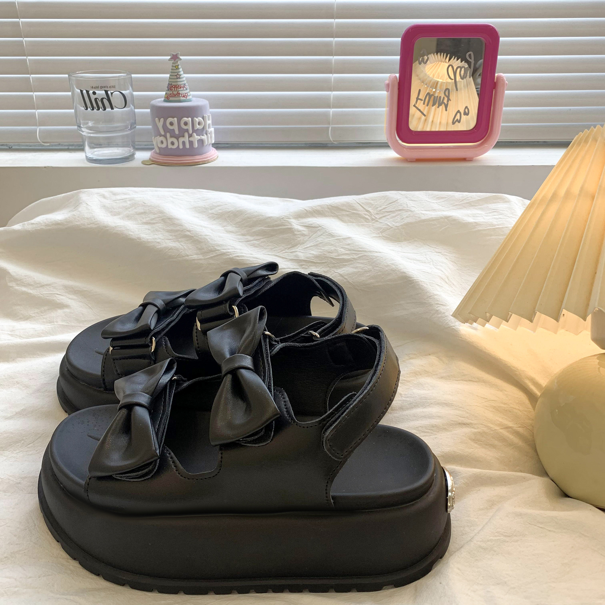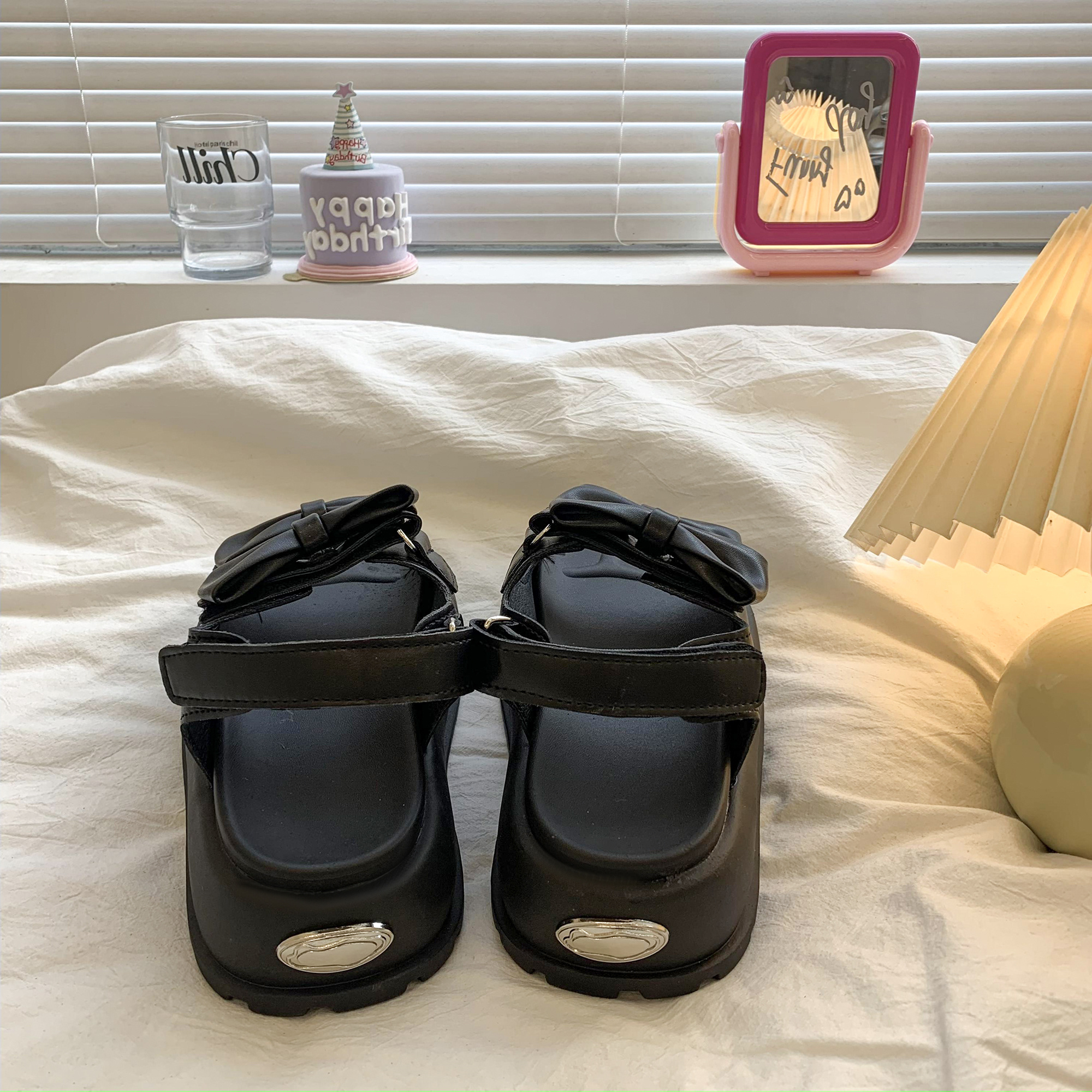 太めのリボンストラップがかわいいウェッジソールサンダル。