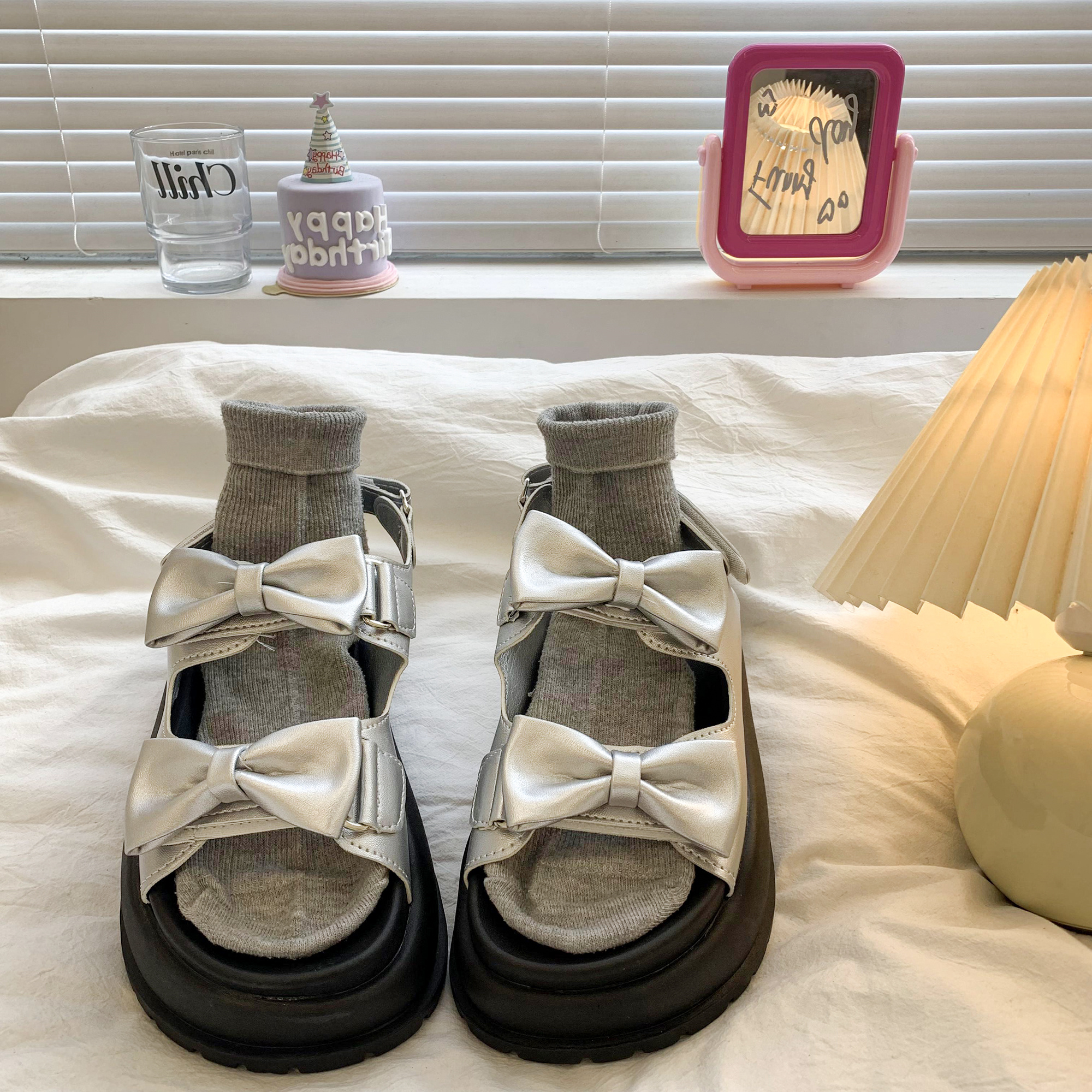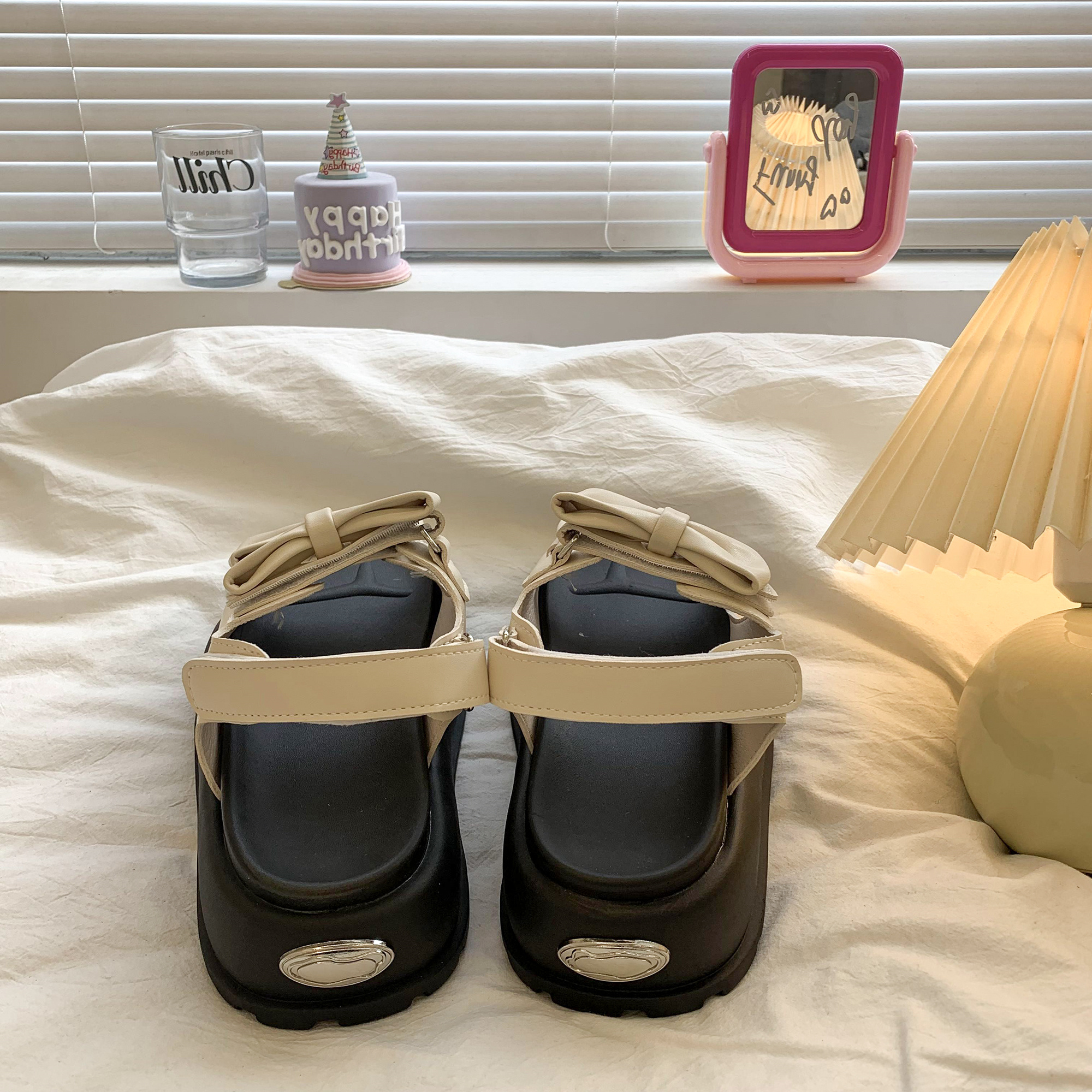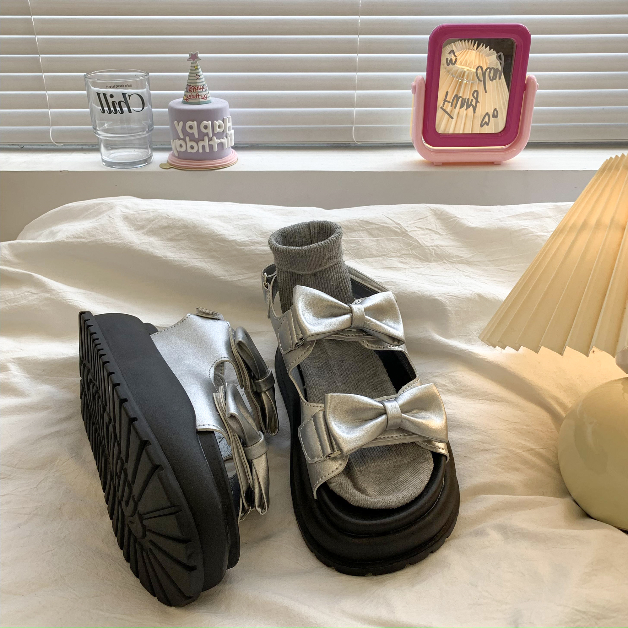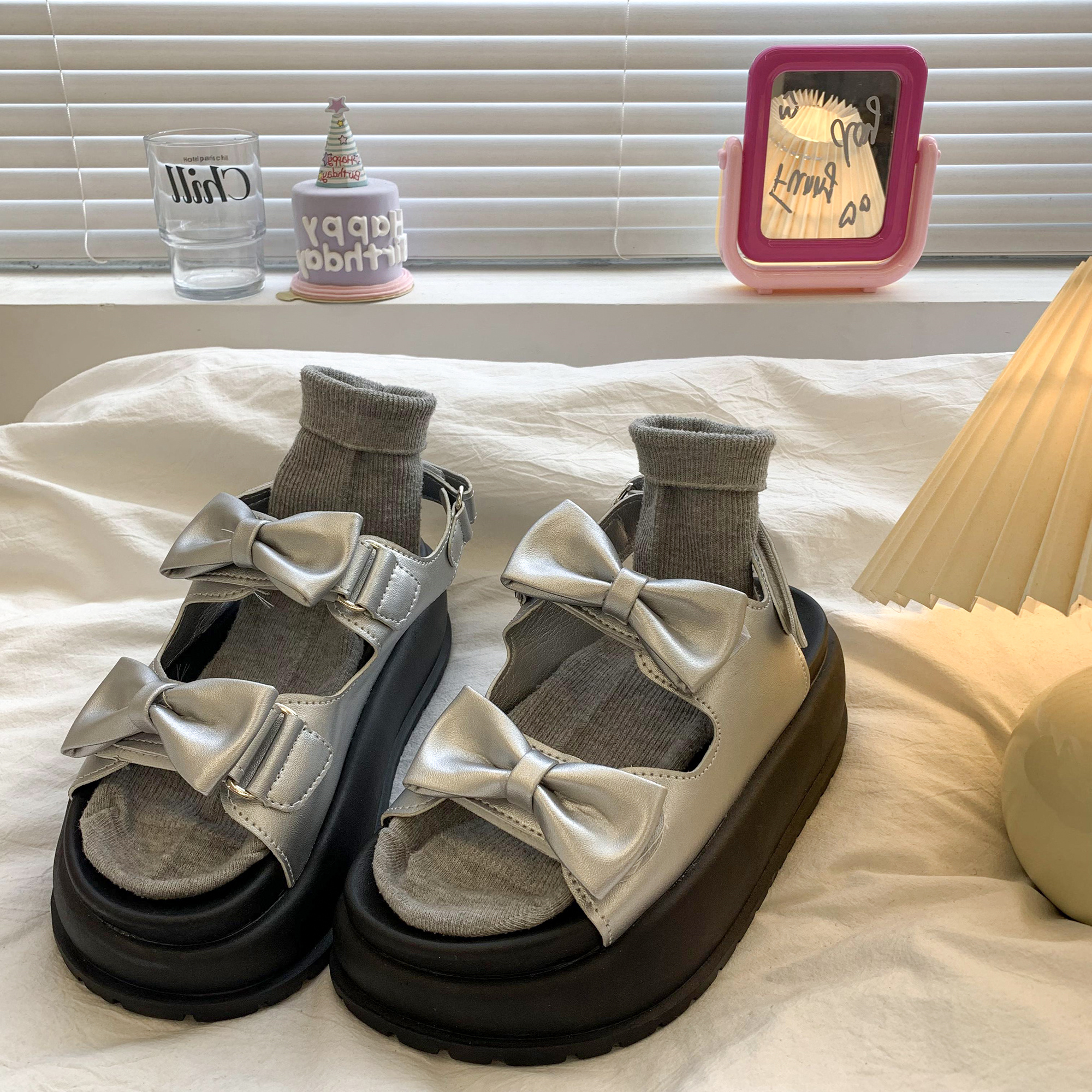 太めのリボンストラップがかわいいウェッジソールサンダル。